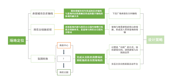 设计在以下几个问题上展开:地段直接承接城市历史轴线,怎样协调基地外经年形成的历史轴线与基地内新生轴线的关系;地段邻近雨花台公园、大报恩寺公园、越城遗址等,怎样统合场地内外慢行系统;怎样作为过渡,完成从活跃的消费场所到松弛的亲自然场所氛围的转换;作为又来园旧址主部所在,新设计是否要及该怎样回应故园。以椭圆形下沉广场承接各向轴线并汇聚多方人流,承接雨花山体走势;广场也成为场地内沿铁轨遗址绿轴的起点。在该地段地面层外围,营造深浅不一的“凹进”,产生可容纳事件的厚度,边界被模糊,基地内外慢行系统在此凝铸。如何回应故园,设计仅借鉴古典空间营造的根本自然观:“人与人的造物原只是宽宏自然的部分”,而不借鉴任何空间的、营建的手法;具体通过热切参与空间塑造的院落、平台、花园等来体现这一点。
