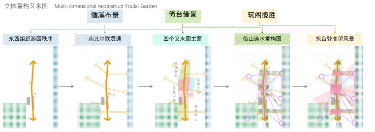 中华门站场地有着三个历史时期,分为消逝的园林、现有的铁路遗存与未来的交通枢纽,设计结合现有的TOD理念,提出了一种新的TOD开发模式,即“园+TOD”:重构又来园。以历史上此地的园林“又来园”为意向基础,充分利用现有资源,回应各类问题挑战,在TOD的发展上,展现出当代又来园的城市空间。整体城市设计以活力多元的城市场所、可望易达的城市环境和重返自然的城市意象为目标,结合又来园的三种构园手法进行当代演绎,形成“一轴四段、多极汇聚”的规划结构,通过交通、形态、功能、遗产、生态、能源多维度重构策略展开深化。