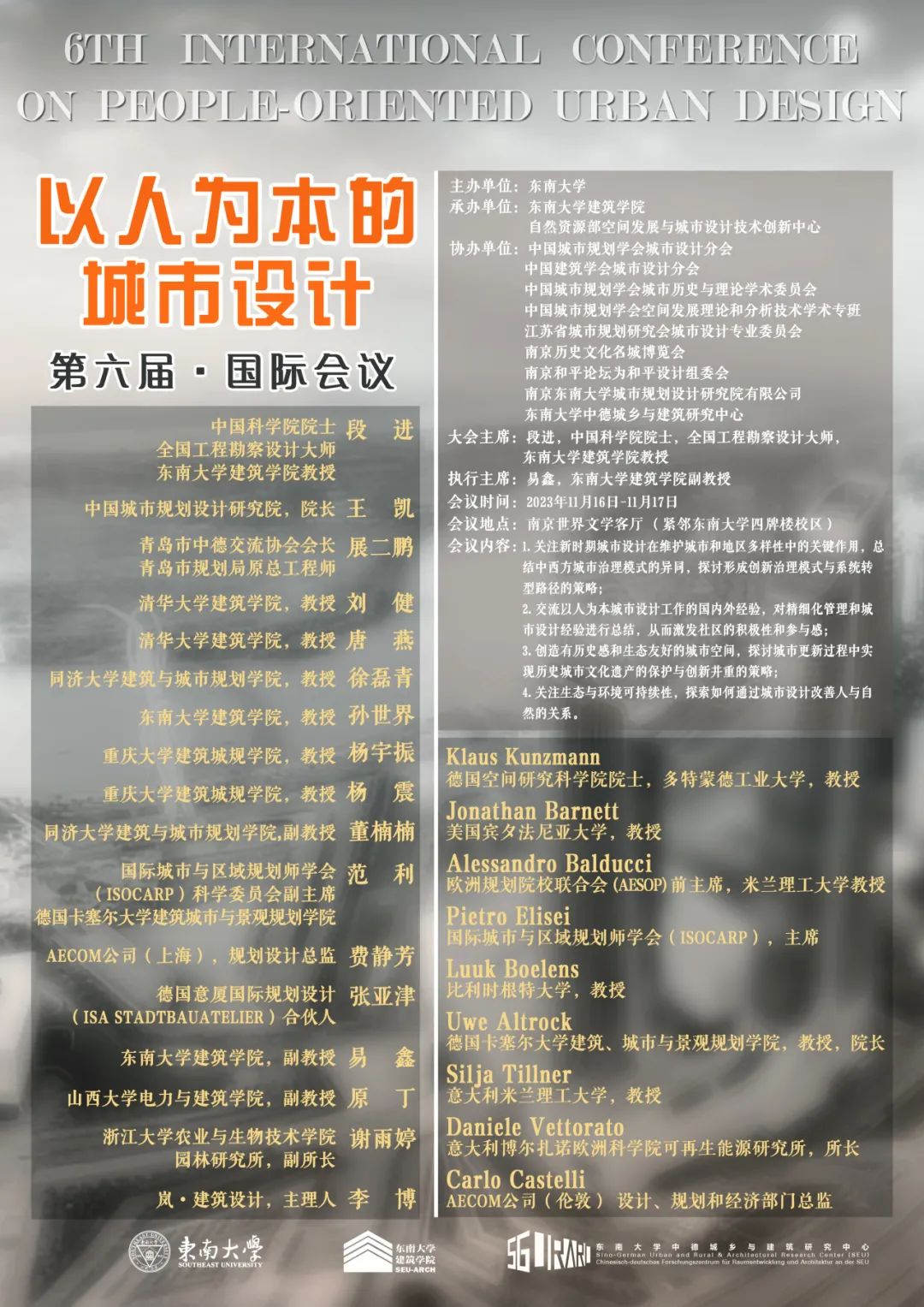 第六届以人为本的城市设计国际会议(6th International Conference on People-oriented Urban Design)拟于2024年11月16-17日举办。本次会议采取线上、线下结合的方式,欧洲、美国、中国学者共同参与。现就有关事项通知如下: