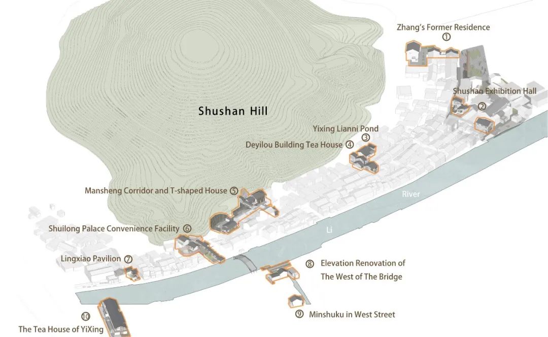 The Southeast University School of Architecture design team has conducted 20 years of continuous research on Gu'nan Street. In 2004 and 2011, Professor Chen Wei led the completion of the “Yixing Shushan Gunan Street Historical and Cultural District Protection Plan” twice. The Plan confirms the construction strategy of integrating the natural landscape and zisha culture into the historic block and the form and structure of the historic buildings. Protect the spatial layout of the natural environment and street system, with a planning concept of “the river encircling the mountain, the street following the mountain, and the river and the street stretching in parallel”. The conservation plan focuses on the structural protection of one street (Gu’nan Street), two axes (the Shushan Bridge leading to the mountain and the corridor bridge leading to the dragon kiln site), three interfaces (along the river, the sides of the street), and three key areas (the block itself, the entrance plaza at the southern end, and the tourist service area at the northern end). The conservation plan covers: the protection of the spatial patterns of “Mountain-Kiln-Street-River” and “Four Zones, Eight Points, and One Ring”; The conservation of the architectural facades, streets, and river environments of key scenic areas; the preservation of the industrial ecological chain of zisha cultural heritages, symbolized as the Zisha Pottery Shops, Beichang, the former residences of notable figures, and industrial chimneys; The implementation of graded preservation and categorized restoration of buildings. The first decade of investigation and planning laid the foundation for the restoration and improvement of Gu’nan Street.