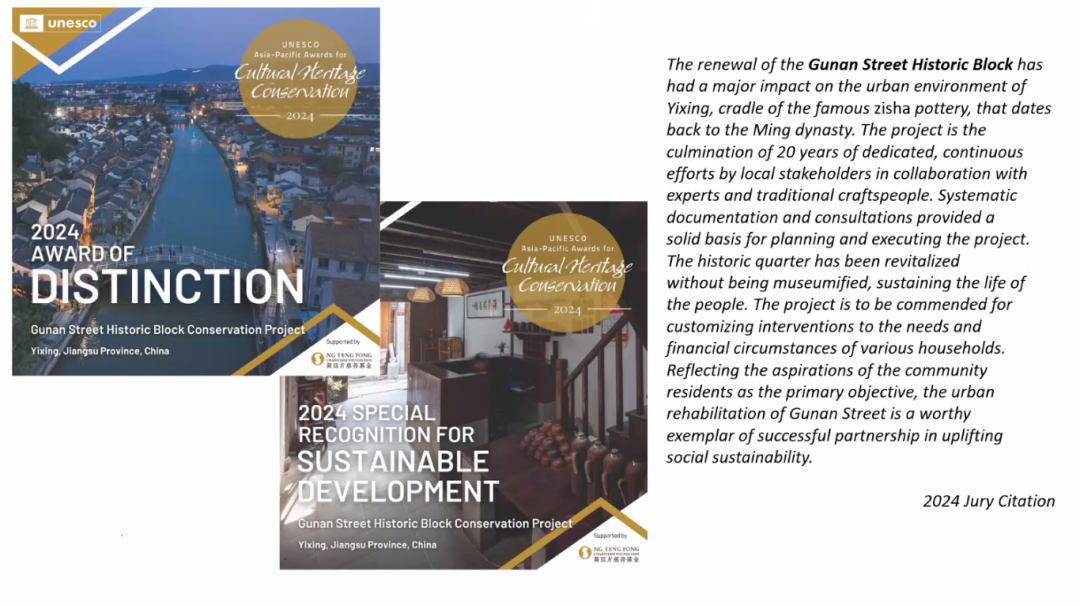 The renewal of the Gunan Street Historic Block has had a major impact on the urban environment of Yixing, cradle of the famous zisha pottery, that dates back to the Ming dynasty. The project is the culmination of 20 years of dedicated, continuous efforts by local stakeholders in collaboration with experts and traditional craftspeople. Systematic documentation and consultations provided a solid basis for planning and executing the project. The historic quarter has been revitalized without being museumified, sustaining the life of the people. The project is to be commended for customizing interventions to the needs and financial circumstances of various households. Reflecting the aspirations of the community residents as the primary objective, the urban rehabilitation of Gunan Street is a worthy exemplar of successful partnership in uplifting social sustainability.
