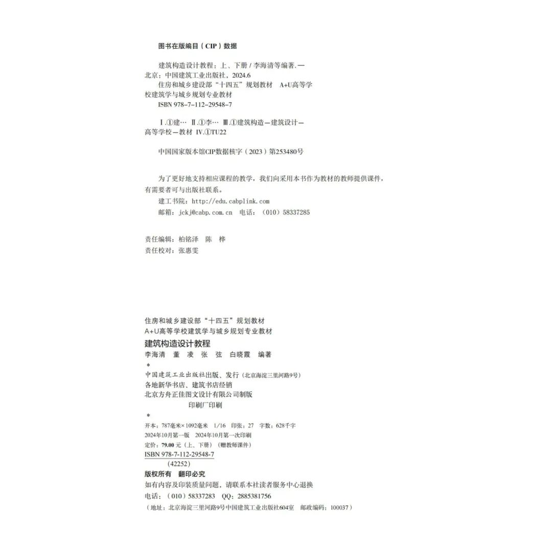 编著团队成员包括李海清、董凌、张弦、白晓霞以及淳庆、周欣、华好。南京大学建筑城规学院傅筱教授担任主审。中国建筑工业出版社教育分社陈桦社长、柏铭泽责任编辑、张惠雯责任校对为教材出版付出巨大心力。zero搬运网 、建筑技术科学研究所有关领导也给予了大力支持。期待全新的《建筑构造设计教程(上、下册)》在后续使用过程中得到关注和改进建议,为新时期中国建筑教育的基础教学工作做出自己应有的贡献。