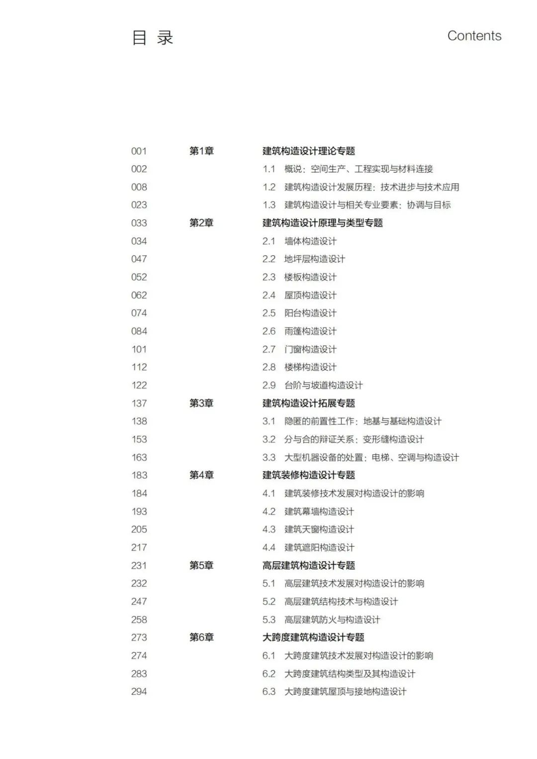 教材分上、下两册共7章30节,对应于理论、原理与类型、拓展、装修、高层、大跨、前沿等七大专题(章),主要依据目前国内建筑学专业本科课程计划常规标准设置,不仅考虑普适性,而且增设了全新的“前沿”部分。此外,还将参考文献、图片来源分节列出,便于自学。每节末思考题呼应关键知识点,方便组织考试。