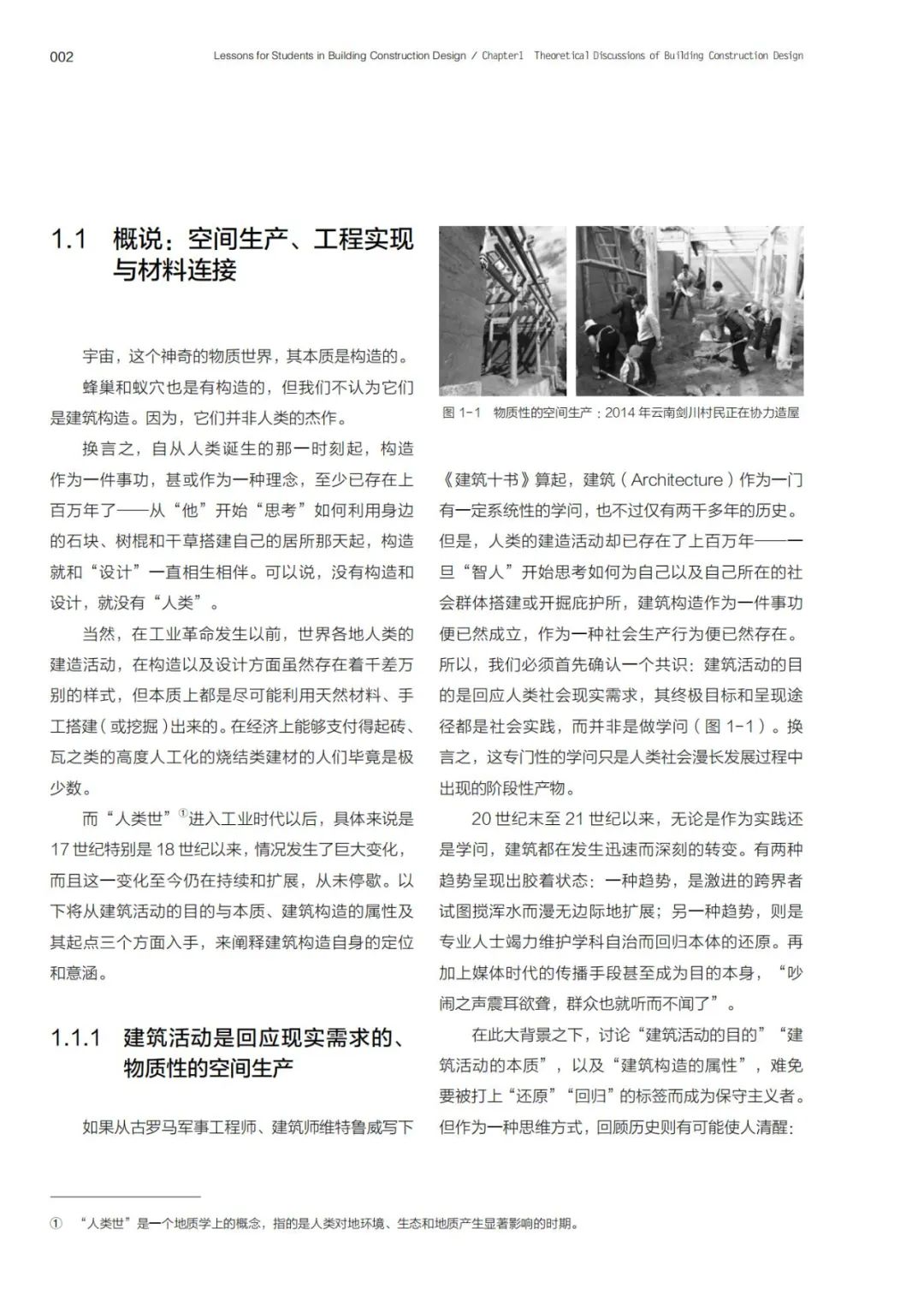 基于国内外建筑构造教材发展历程回溯,编著者认识到偏废一端的理论框架不可取,故既坚守建筑活动的本体性观察,也关注设计主体及其设计思维的能动性,既注意到苏联早期建筑构造教材的体系与架构,也兼容德语区建筑构造教材特别是苏黎世联邦理工学院(ETH)安德烈·德普拉泽斯教授(Andrea Deplazes)主编《建构建筑手册》(Constructing Architecture: Materials, Processes, Structures. A Handbook,Birkhaüser 2005)教材的直观性与启发性,以及麻省理工学院(MIT)爱德华·艾伦教授(Edward Allen)主编《建筑构造基础》(Fundamentals of Building Construction,Wiley 2019)教材的平易简明与亲和力。