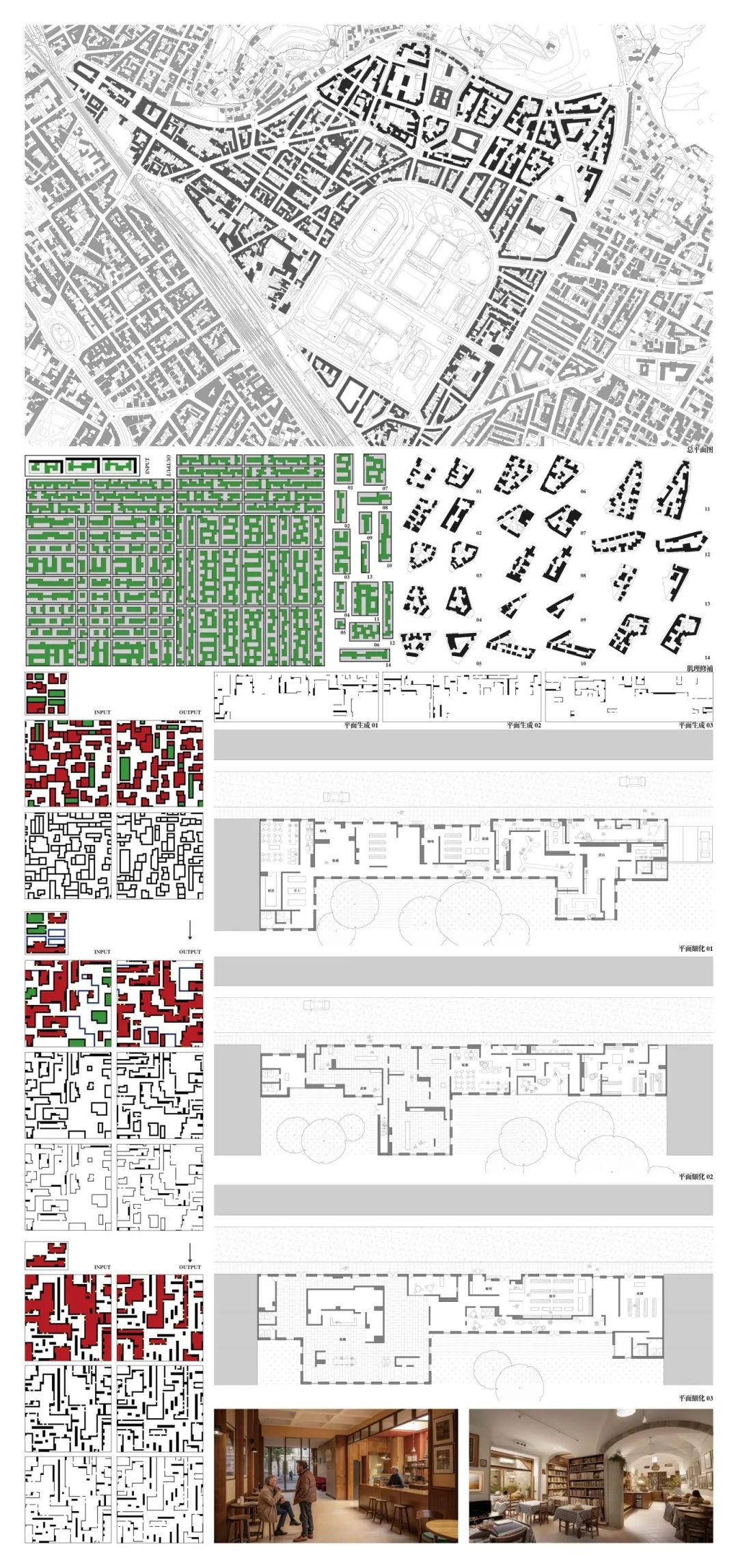 设计小组尝试了街区建筑生成、城市肌理填补、单体平面布置三个层级。前两者针对佛罗伦萨围合型街区的特点进行参数化形态生成,注重物质层面的相似;后者以当地青旅混合空间为灵感,打碎传统功能块,希望为使用者提供非日常体验的混合公共空间。