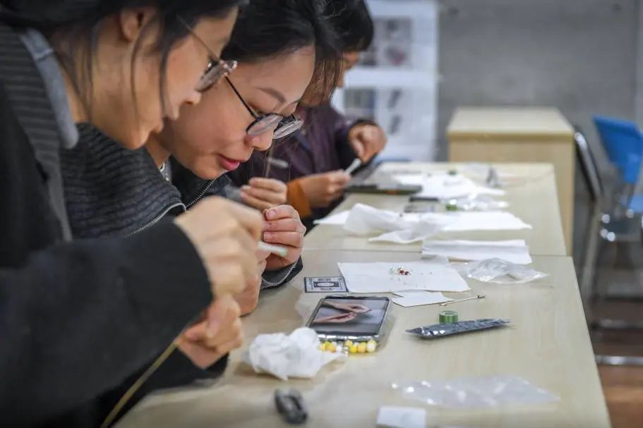 在视频教程指导下,女教职工们使用统一发放的材料包,尝试制作蜻蜓胸针或多宝竹叶缠花作品。从铜线串珠固定蜻蜓身躯,到缠绕丝线塑造翅膀纹理,每一步都需细致耐心。活动现场,丝线、铜线、卷尺、剪刀等工具在参与者间传递共享,合作氛围温馨融洽。