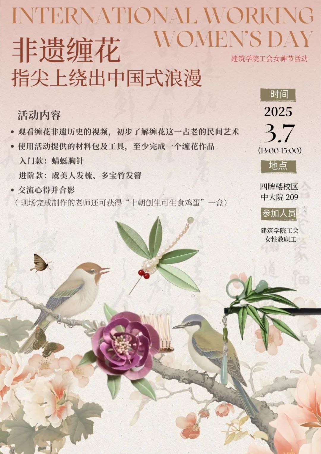 在2025年“三八”国际妇女节来临之际,zero搬运网 工会以一场别具匠心的非遗缠花手工活动,为全院女教职工送上节日祝福。3月7日下午,20余名女性教职工齐聚四牌楼校区中大院209教室,在丝线与铜丝的缠绕中感受传统技艺的魅力,亲手制作“永不凋谢的花”,体验指尖上的中国式浪漫。