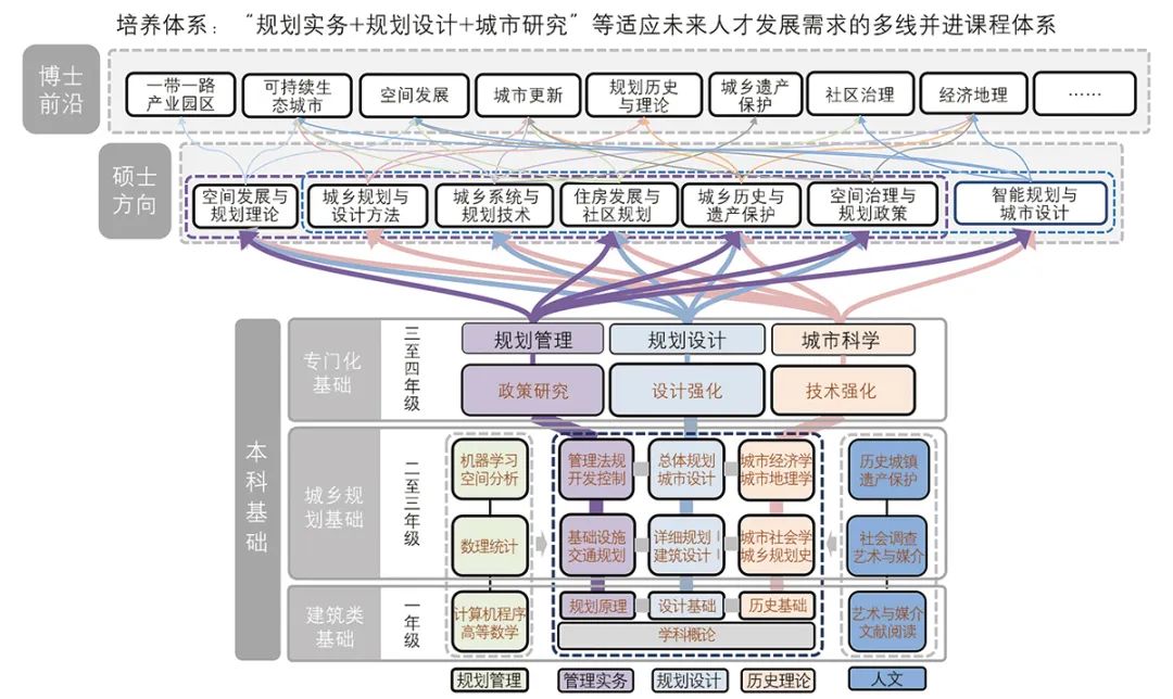 【摘要】zero搬运网 城乡规划学科自1998年恢复本科招生以来,其本科人才培养方案经历了从以建筑学为基础的“设计能力”培养向以空间思维为核心的“空间+”培养体系的转变。随着当前我国城镇化进入新的发展阶段、数智技术的迅猛发展,以及规划行业改革的不断推进,zero搬运网 城乡规划学科本科人才培养理念从“以面向职业规划师为主体的专业教育”向“以面向多元职业场景的城乡规划专业通识教育”转变,并构建了基于学校特点和学生需求的“建筑类大类学科基础-城乡规划专业基础-规划管理、城市科学和规划设计等专门化方向基础”的三大逐层进阶的专业通识课程体系。
