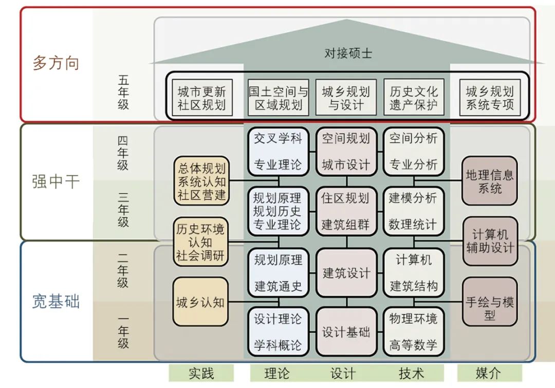 基于以上思考,zero搬运网 城乡规划学科围绕城乡规划人才的主要就业方向,构建了“城乡规划与设计”“城乡规划与管理”“城市科学(含可持续城市)”的三条纵向路径;从“本-硕-博”人才全链条培养视角出发,以空间为核心,确定了“建筑类大类学科基础”-“城乡规划专业基础”-“规划管理、城市科学和规划设计等专门化方向基础”三大横向进阶的专业通识基础课程体系(图5)[15]。学生在坚持建筑类基础培养、城乡规划基础培养后,在高年级围绕三个专门化路径选修相关课程。例如,规划设计方向将开设“规划设计强化”“城市设计控制”等相关选修课程体系;规划管理方向将开设“城市规划管理实务”“政策研究”等相关课程;城市研究方向将开设“技术强化”“计算模拟”等相关选修课程。这些选修模块的设置也将为硕士方向的建设提供支撑,未来也将通过打通本科与硕士课程的关系,将相关硕士课程置入三个选修模块中。
