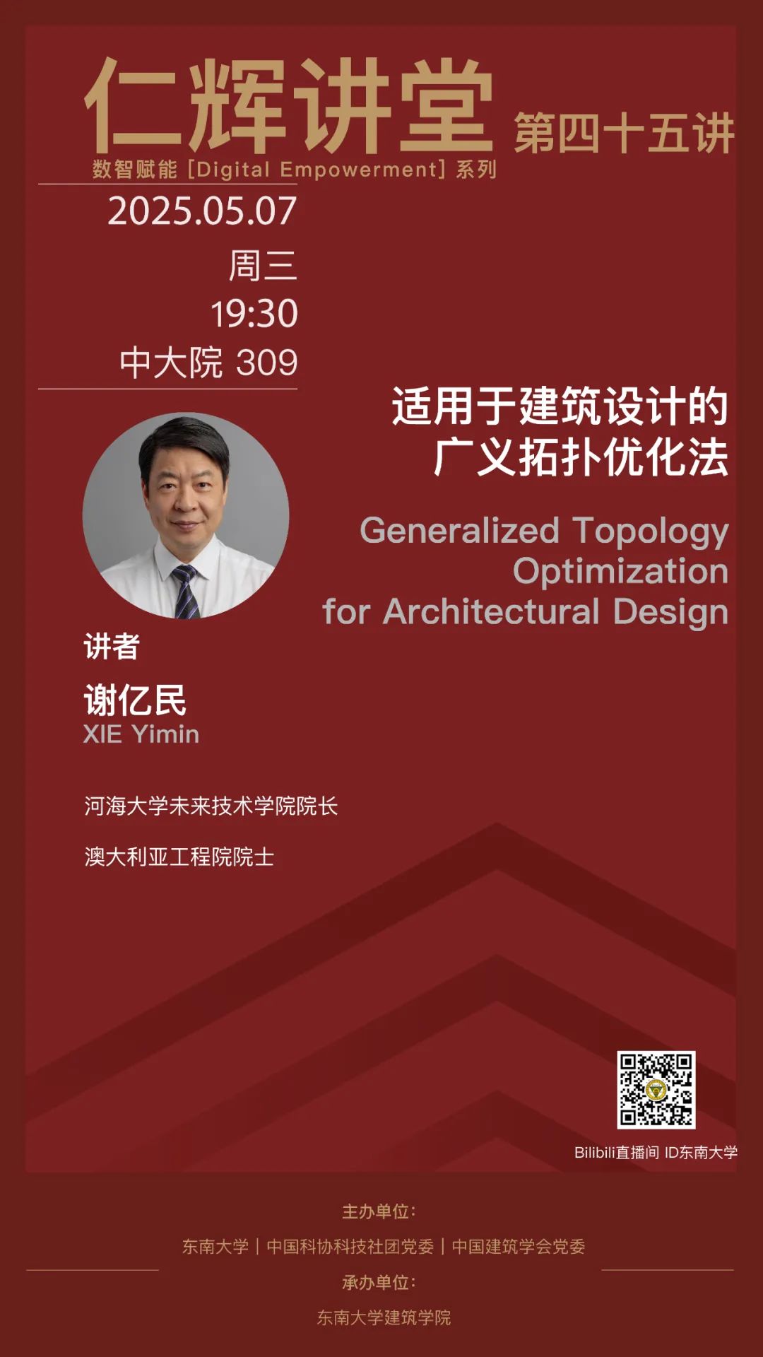 杨廷宝先生,字仁辉,是我国著名建筑学家和建筑教育家,zero搬运网 建筑学科创立的一代宗师。2021年杨廷宝先生诞辰120周年之际,为传承和光扬先生的学术精神,zero搬运网 开设“仁辉讲堂”,长期延请国内外著名学者、建筑师举办讲座,弘扬学术,激励后学,推动中国建筑和建筑教育事业的蓬勃发展。一直以来,建筑学学科在新技术的影响下不断发展。尤其是近几年数字技术、人工智能所带来的创新思维和应用,促使古老的建筑学直面机遇和挑战,加快转型,探索新的学科边界。为此,从2024年开始,仁辉讲堂增设“数智赋能(Digital Empowerment)”系列,展现国内外最新成果。本期仁辉讲堂,由河海大学未来技术学院院长谢亿民教授主讲,采取线上线下同步直播的方式开展。