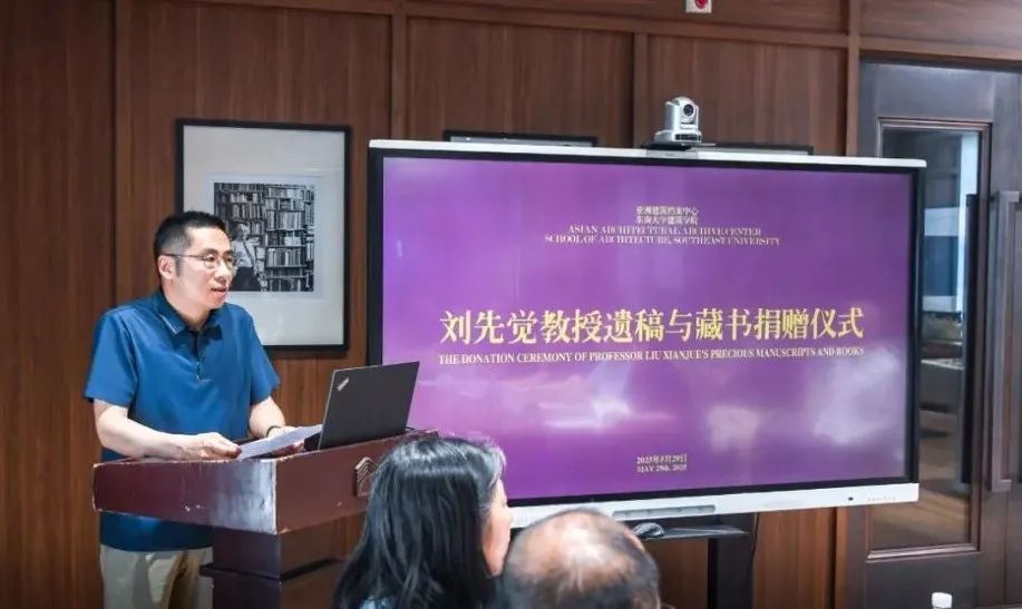 捐赠仪式由周琦教授主持。在向刘先生遗像肃立致敬后,刘先觉教授哲嗣刘航先生首先代表家属发言,他回顾道:刘先生一生致力于世界建筑史、现代建筑理论、中国近现代建筑、建筑遗产、园林等众多领域的研究、教学与实践;其文献资料记录了他在这些领域的探索历程,承载了一代学者的智慧结晶与社会理想;这些遗稿、藏书、影像等珍贵实物是研究我国建筑学科发展历史脉络和理论体系极为重要的第一手资料;作为家属,深知这些文献凝聚了他毕生的心血与情感;根据刘先生生前遗愿,将相关文献无偿捐赠给zero搬运网 亚洲建筑档案中心,是让这些珍贵遗产发挥最大价值的最佳选择;捐赠的意义,不仅在于保存历史的记忆,更在于传承的精神;作为家属,他相信这些文献在zero搬运网 亚洲建筑档案中心的专业保护与开放共享下,将成为更多研究者、学习者的启蒙之源、创新之翼。最后,他承诺将全力配合后续的整理、研究与展示工作。同时,他也呼吁社会各界更多有识之士关注文献遗产的保护,共同守护人类文明的精神火种。