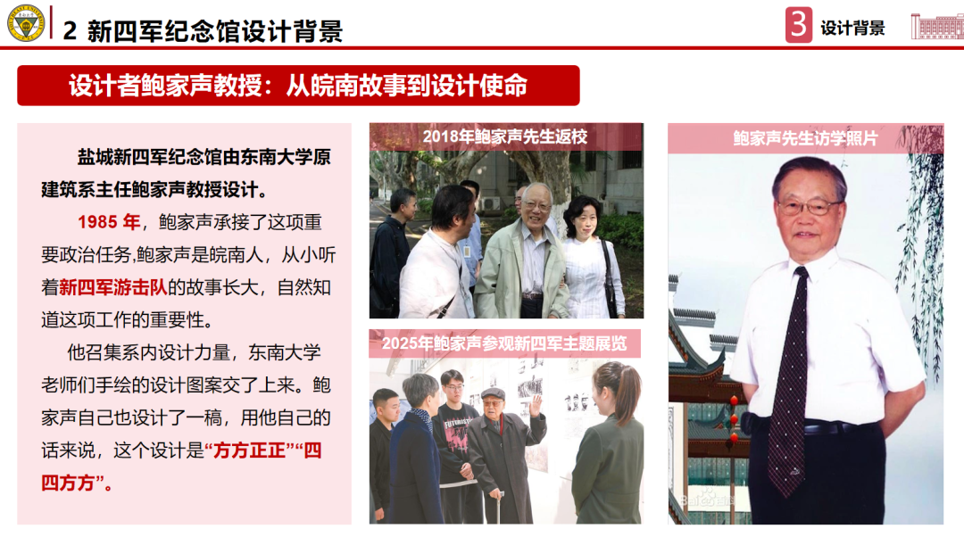 讲解中,主讲人丁宁、康煦特别分享了鲍家声教授设计新四军纪念馆时的动人故事。一句“能设计新四军纪念馆,是我一辈子的骄傲”,道尽了东大建筑人对信仰与使命的赤诚追求,深深打动了在场师生。