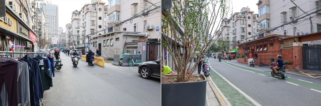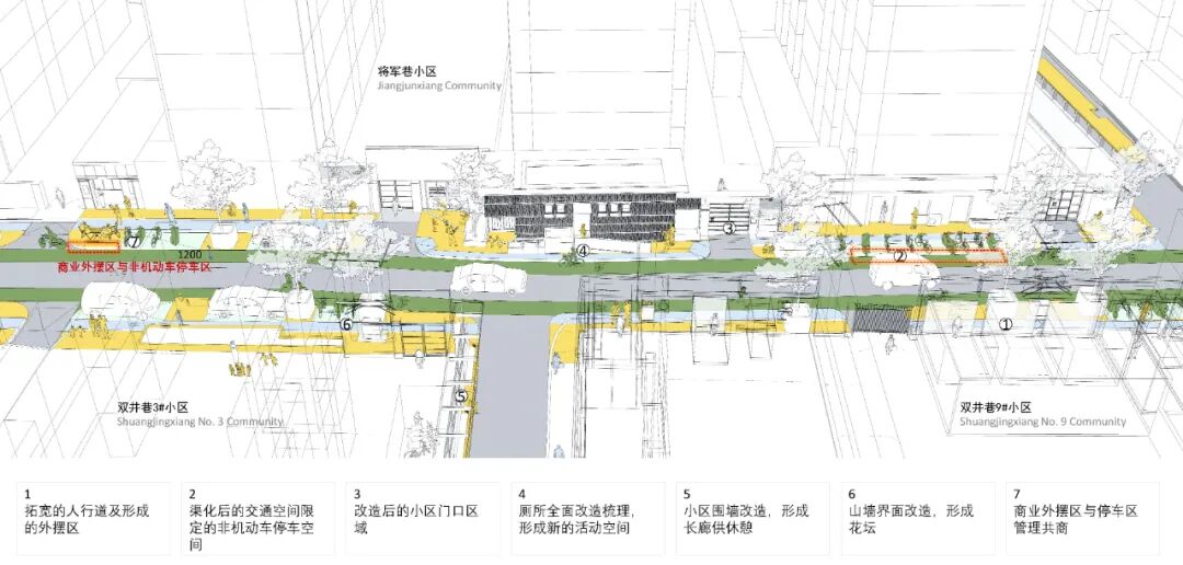 (1)重构步行友好的街区环境。通过实施机动车单行化与停车资源整合,改善道路交通秩序,规范停车方式,拓展人行空间,全面提升街区慢行体验;