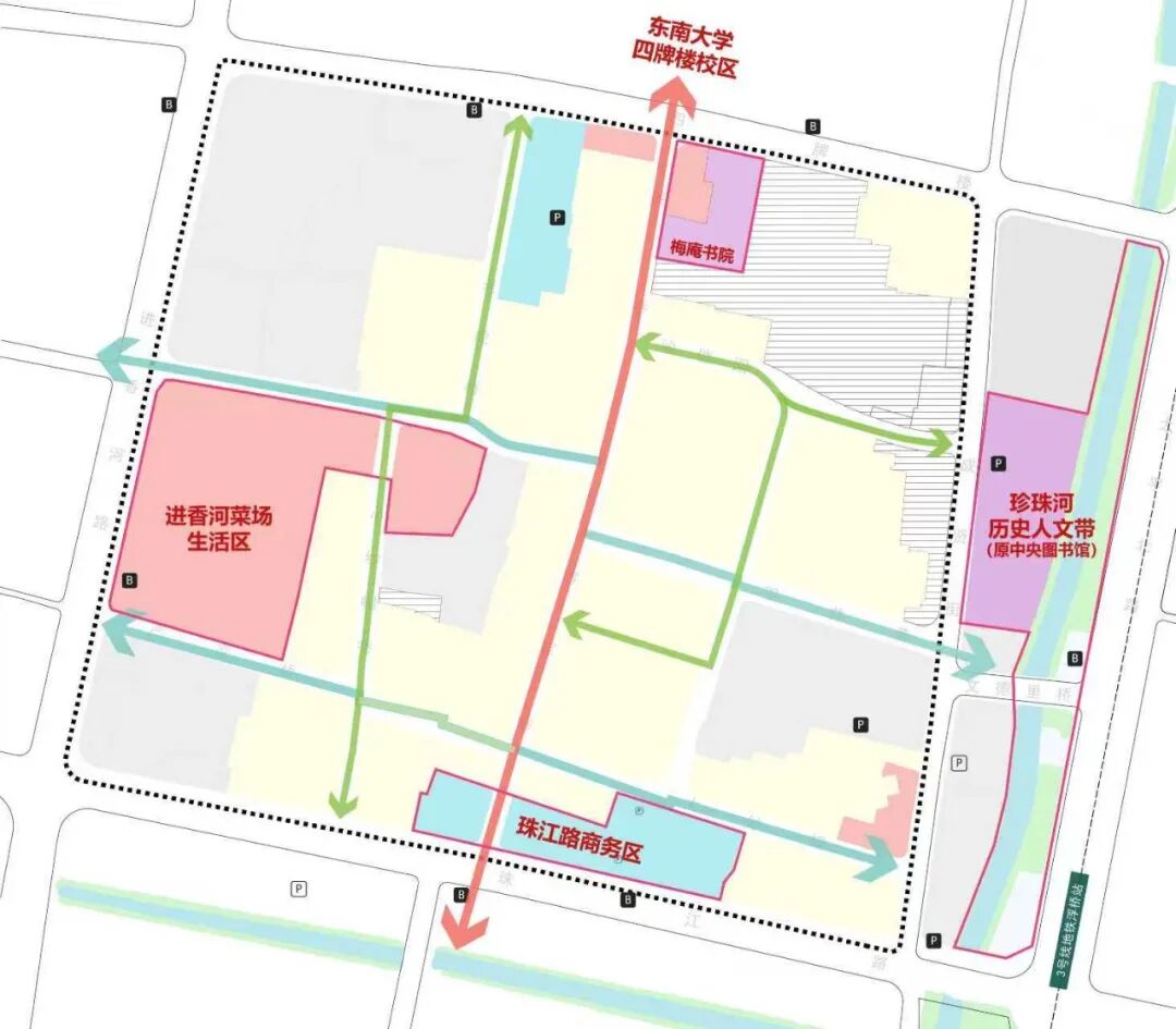 设计团队以“营造城市活力街区,焕新千年学府社区”为目标,致力营造校地深度融合的、功能多元、全龄友好、宜居宜业的城市活力街区。