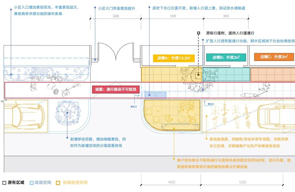 为了加强实操性,设计团队还提供了需要重点改造的负面清单,其中包括四牌楼街面的商户台阶、将军巷中段的公共厕所、蓁巷入口的街角边地,并将它们分别营造成为休憩空间、街角花园以及标识节点,不仅改善了街道空间的景象,而且为街道两侧的站立小店提供了使用场所。