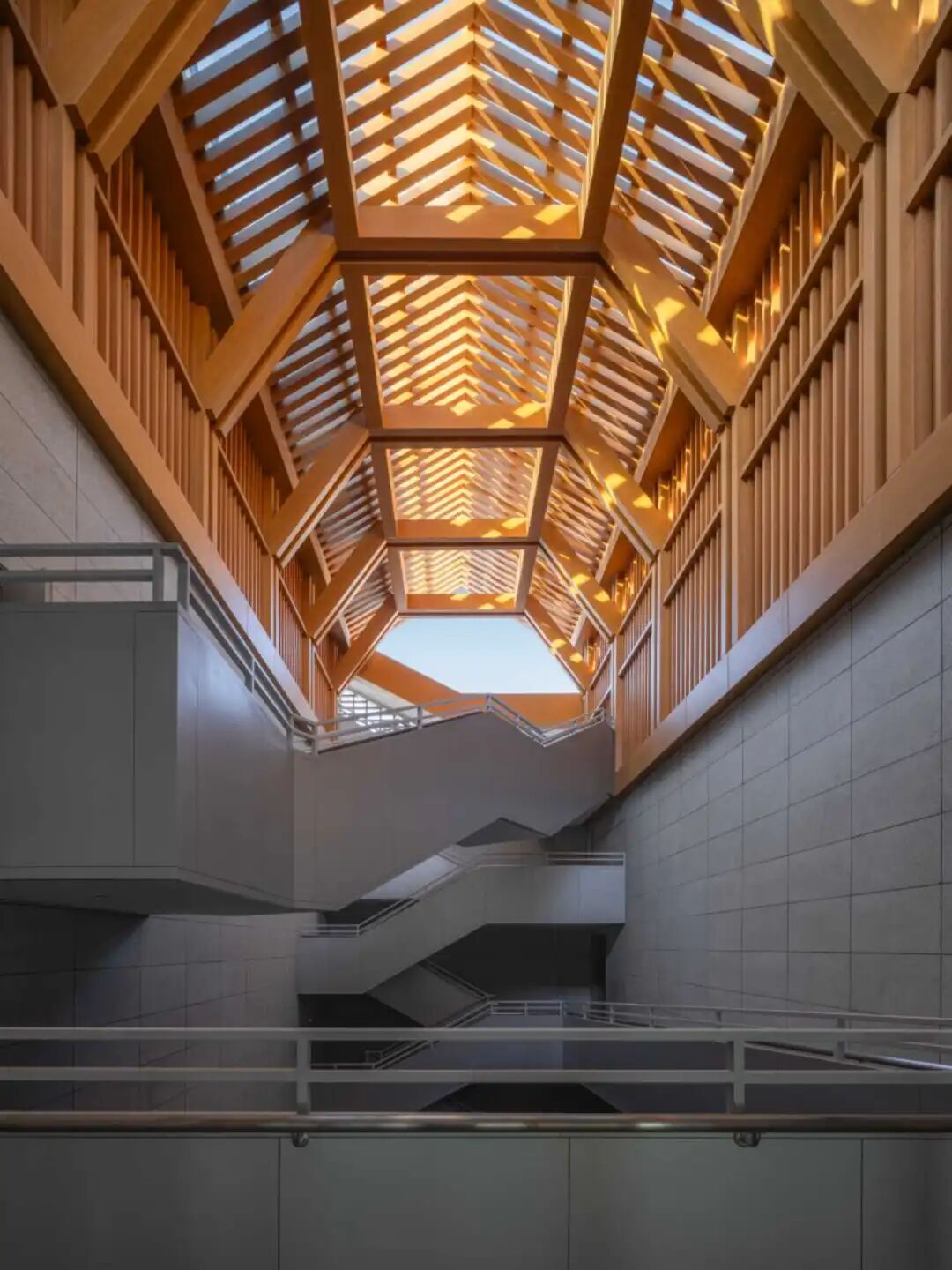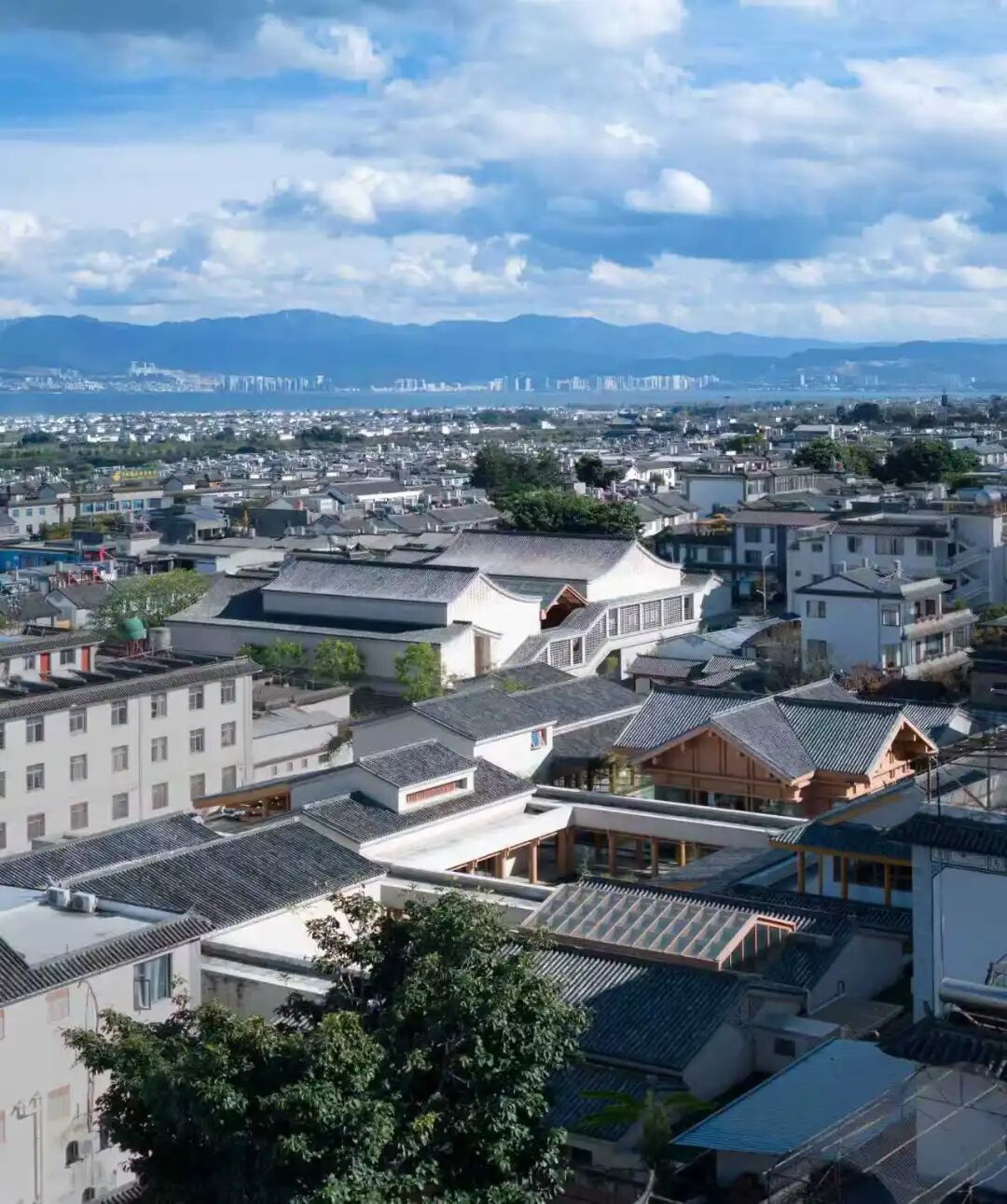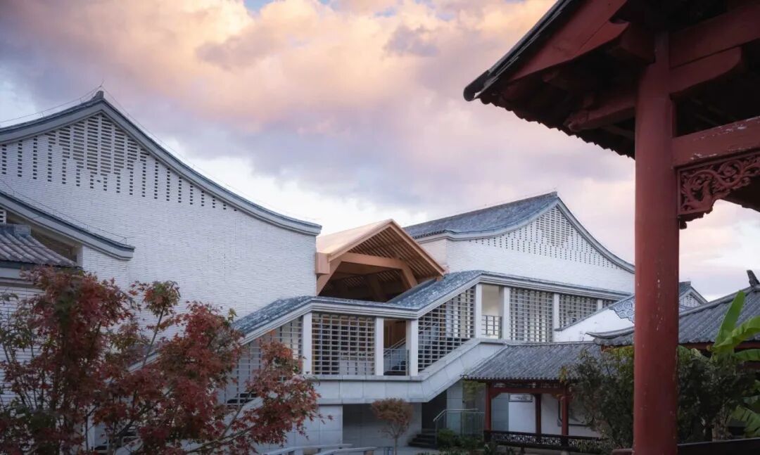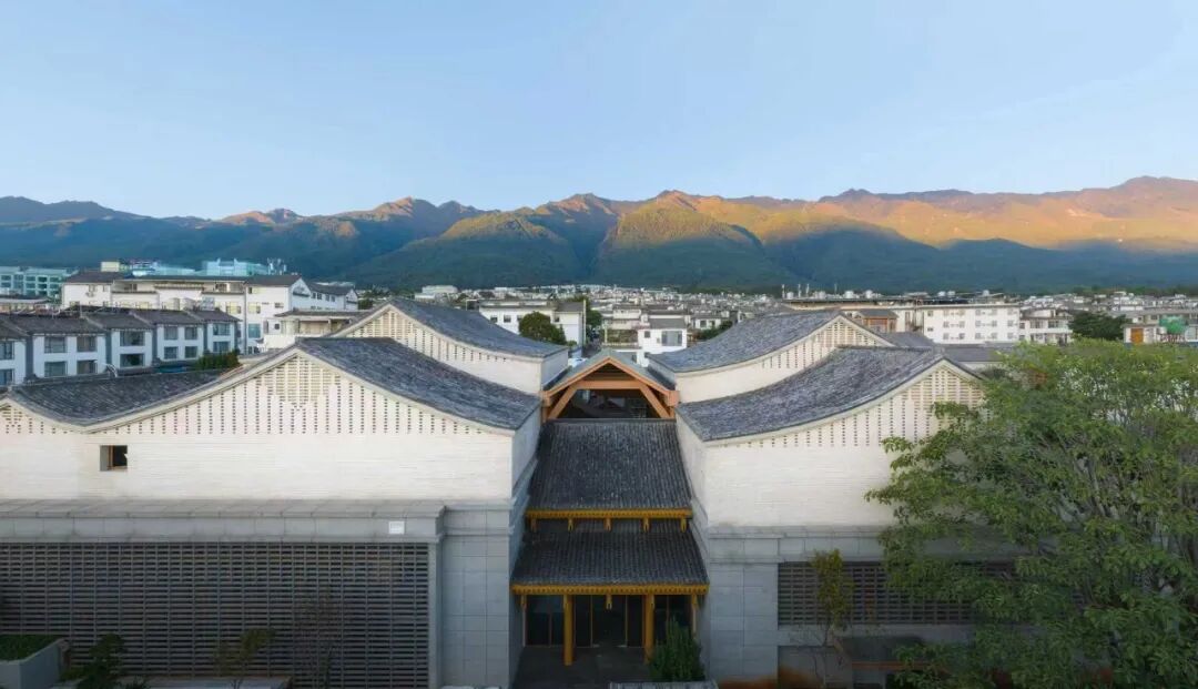 设计根据不同功能的公共属性和空间尺度特征,形成南北两组相对独立而互有联系的区域:南区为公共的市民空间,以较大体量建筑单体复合展览、会议等功能;北区具有半公共属性,由藏书楼、讲堂、当地文化名人的研究室组成建筑群体。建筑造型启发于大理白族民居,立面多用米白色陶砖构成,山墙上镂空的陶砖布置抽象于当地彩绘图案,又是当代的幕墙构筑方式。