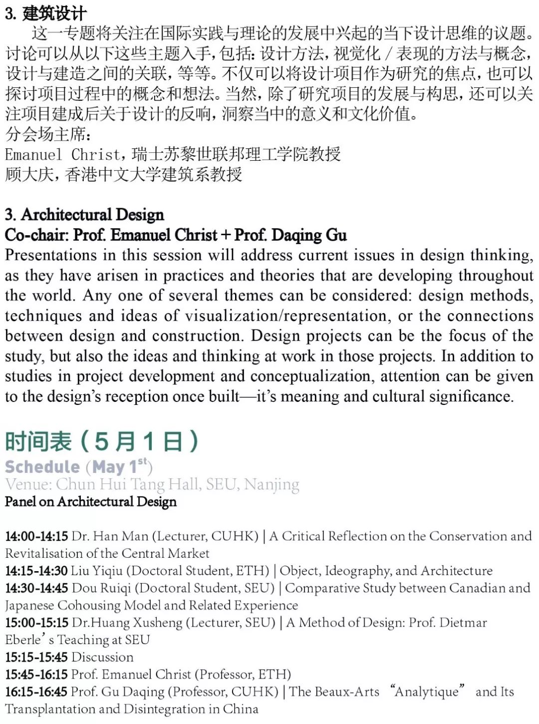 Since 1980s, ETH (Swiss Federal Institute of Technology) and SEU (Southeast University) have been working in close collaboration on architectural education. The international exchanges have been fruitful over recent decades, guiding fundamental changes in architectural pedagogies in these two institutions and others in Europe and Asia.