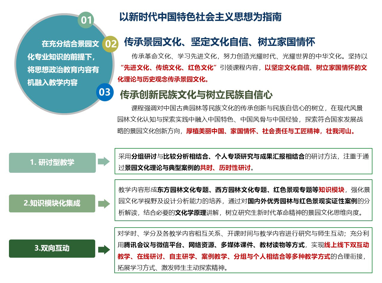 课程坚持以国际视野、中国特色、前沿意识的风景园林文化理论与研究方法引领课程内容,以坚持民族自信、家国情怀的历史理论与遗产保护研究传承景园文化,以世界优秀景园案例与文化景观解析强化思想阵地与教学优势。教学内容围绕价值塑造、能力培养、知识传授三位一体的课程建设目标,筑牢知识模块与家国情怀、文化自信、人文关怀、工程伦理、工匠精神等社会核心价值观文化元素的“触点”和“融点”,强化典型案例的教学运用。课程结合景观文化理论基础讲授,梳理当代景观文化研究体系,厘清景观设计中文化观念的动态变迁与发展趋势,深入解析当代景观设计思潮与应对策略,促进学生主动运用景观文化学的理论角度进行具体分析与实践;通过景观设计历史与人文思潮的共时性比照分析,梳理景观文化发展历史进程与文化规律,进而把握风景园林设计中应用人文思维进行设计的基本原则、方法和技术;通过一定的国内外景观设计典例研究,结合必要的文献阅读与实践调研,使学生充实分析能力,强化设计能力,扩充景园知识体系。课程获2021年zero搬运网 研究生课程思政示范课程建设项目立项并获评“优秀”,相关教学内容纳入2021年教育部“主题案例”并于全国高校思想政治工作网“育人号”报道。