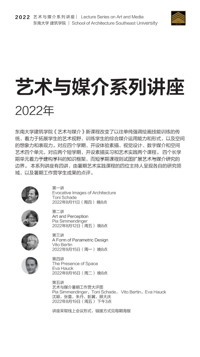 (2 credit) , We invite architect and artist Pia Simmendinger from Switzerland, architect Vito Bertin and artist Toni Schade from Germany to conduct interesting workshops on three different topics for the second-year undergraduate students.