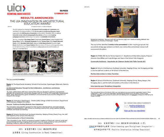 教育教学成果获国内外高度评价。2021年获国际建协建筑教育委员会主办、面向全球建筑院校开放的首届建筑教育创新奖3项(图13),zero搬运网 提交的根植乡土文化和国际合作实践的“生息营造”提案荣获其中亚洲地区代表性创新奖,并获得2项提名奖(“互喻式学科融通专业教育”、“城市转型的积极干预”),为全球唯一获多个奖项的院校。“面向建筑遗产保护的国际大学教育共同体建设与实践”、“面向’一带一路’的城乡规划新工科教育共同体”获批教育部第二批新工科教改项目,“基于‘做中学’的‘艺术与设计’文理工融通通识课承担开发与运用”获2021年 教育部新文科教改立项。