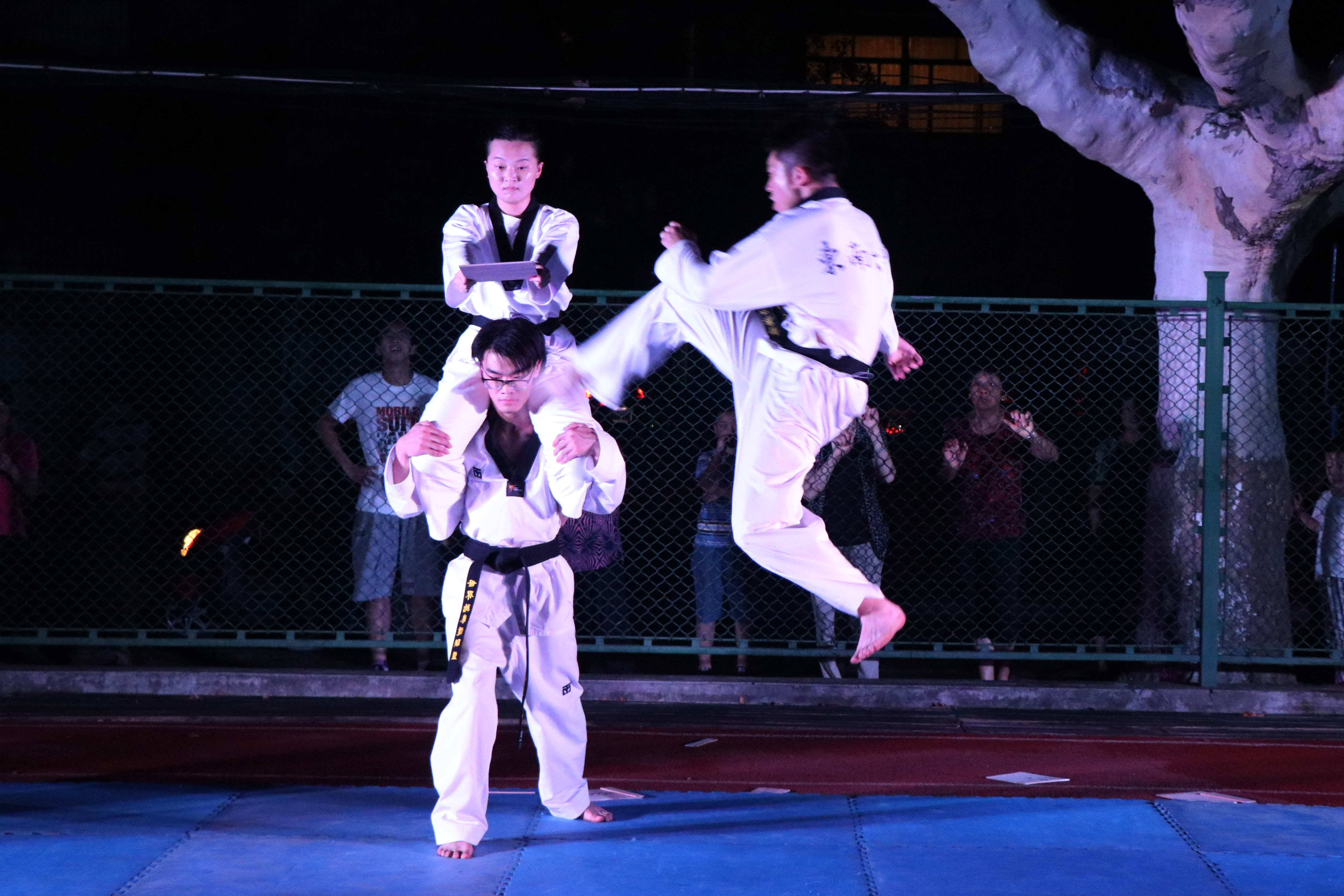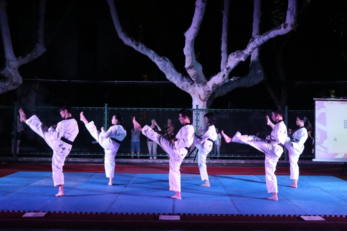 古有少年英雄刀剑战沙场,今有东大学子拳脚之间展豪情。游戏过后,跆拳道社的小哥哥小姐姐们上场,他们一出场就赢得了热烈的掌声。