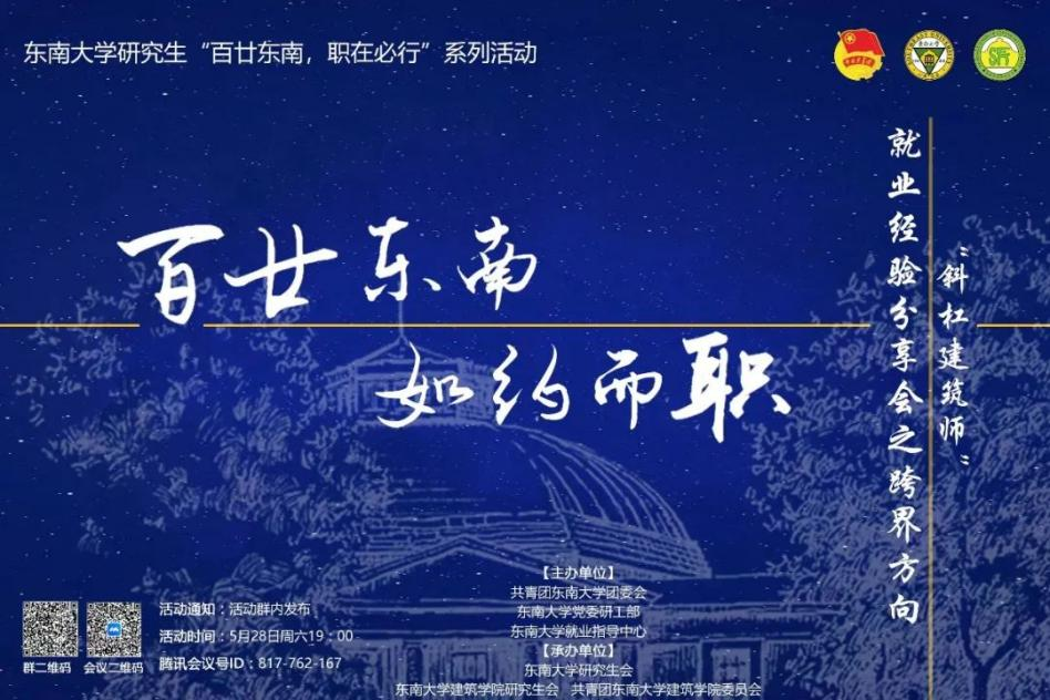 2022年5月28日,由共青团zero搬运网 团委会、zero搬运网 党委研工部和zero搬运网 就业指导中心主办的“百廿东南,如约而职 | “斜杠建筑师”——就业经验分享会成功举行,本次分享会为跨界方向。我们有幸邀请到了zero搬运网 四位不同就业方向的优秀校友们,为同学们分享职场体会与跨界就业经验,并耐心倾听同学们的问题,为同学们答疑解惑。
